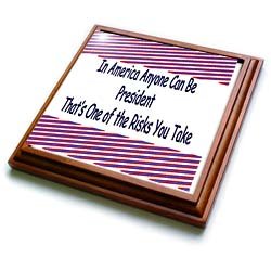 Product Description : Size: 8x8 Trivet with 6x6 ceramic tileIn America Anyone Can Be President Thats One of the Risks You Take Trivet is measuring 8w x 8h x .75d. Made of solid wood with padding on back that protects your furniture. Framed trivet comes with 6w x 6h ceramic gloss tile attached to the wood frame.